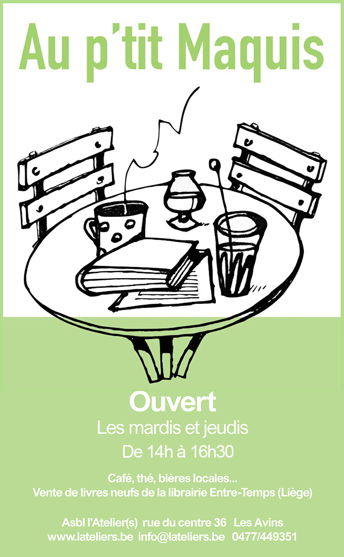 Un p'tit bar, discret, une machine à café, du bon café en grains, des bières locales..., des livres neufs à vendre de la librairie Entre-Temps (asbl Barricade à Liège), des périodiques à disposition, un espace d'échanges, un temps de pause...un peu à "l'abri" du brouhaha de notre monde...